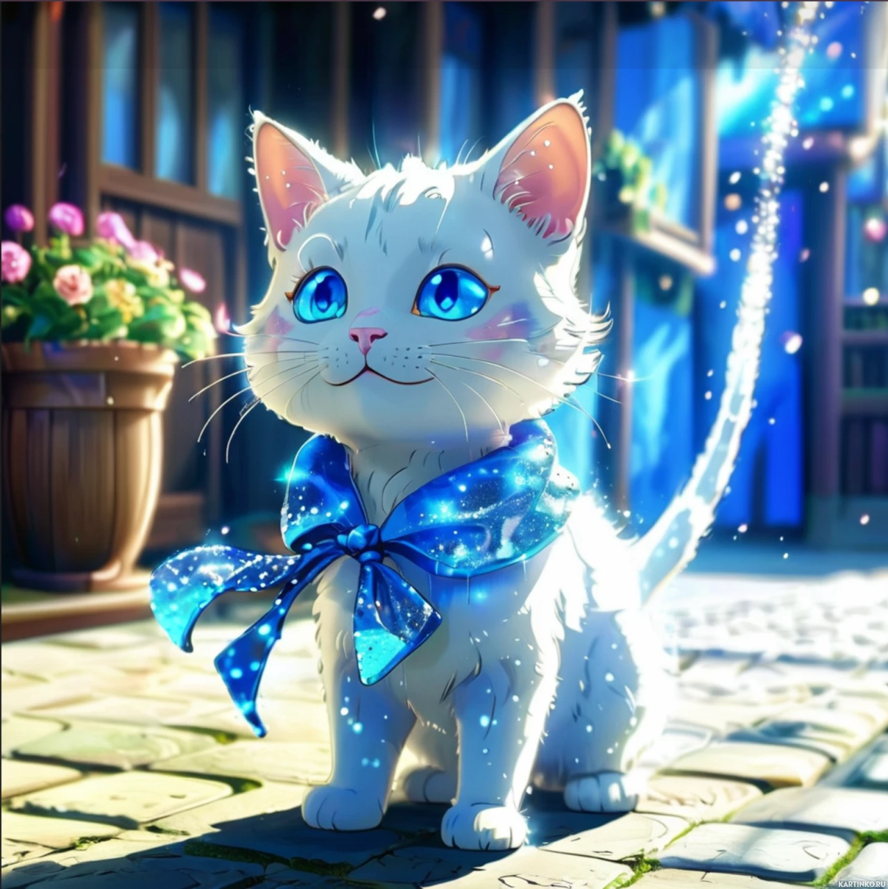 На картинке изображена стилизованная иллюстрация белого кота с голубыми глазами, стоящего на мощеной улице ночью. У кота довольное выражение мордочки, а на шее – фиолетовый бантик, что намекает на то, что он, возможно, нарядился для особого случая. На заднем плане видны светящиеся окна с занавесками, создающие теплое свечение, которое контрастирует с окружающей темнотой. На улице стоит горшок с цветами или растениями. Общая атмосфера картинки – сказочная и волшебная, что подчеркивается мерцающими звездами или огоньками, парящими в небе над головой кота.