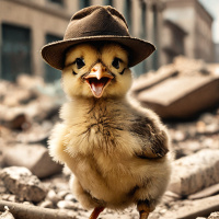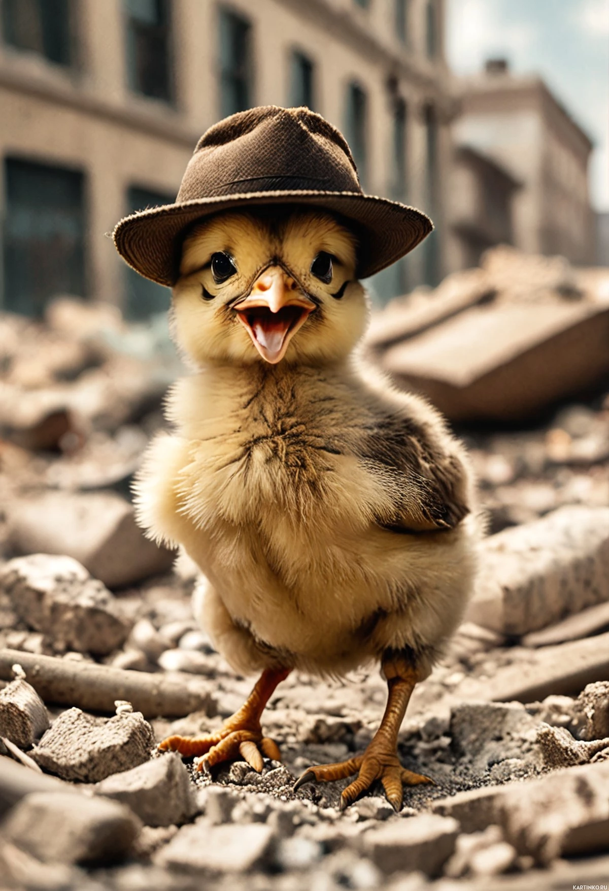 На картинке изображён цыплёнок, стоящий на обломках, возможно, после землетрясения или сноса. На голове у цыплёнка – коричневая шляпа-федора, добавляющая этой, в остальном хаотичной сцене, нотку сказочности. На заднем плане видны повреждённые здания, что говорит о городской среде.