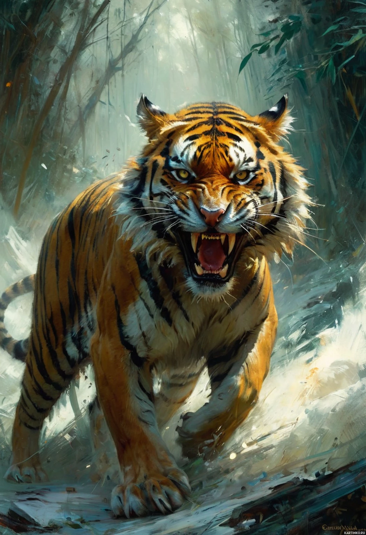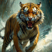 The image depicts a tiger in a dynamic pose. The tiger has its mouth open, possibly roaring or growling, and its eyes are directed towards the viewer. It appears to be standing on a rocky surface, with vegetation suggesting a jungle environment. There is water splashing around the base of the scene, indicating the presence of a body of water nearby. The overall lighting suggests an early morning or overcast day, with cooler tones dominating the palette. The style of the artwork is realistic with a high level of detail and texture.