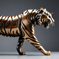 The image features a three-dimensional sculpture of a tiger in an upright position, walking forward with its head turned to the left side. The sculpture is detailed and lifelike, capturing the distinctive striped pattern of a tiger's fur. The background is neutral, which highlights the subject of the artwork.