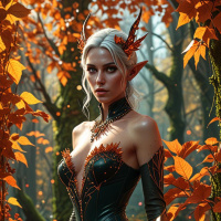 На картинке изображена фигура, похожая на эльфа, стоящая в лесу, усыпанном осенней листвой. У эльфа белые волосы и заостренные уши. На ней костюм, включающий доспехи с замысловатыми узорами на нагруднике и, по-видимому, шлем или головной убор с рогами. Фигура смотрит прямо перед собой, глядя на зрителя.