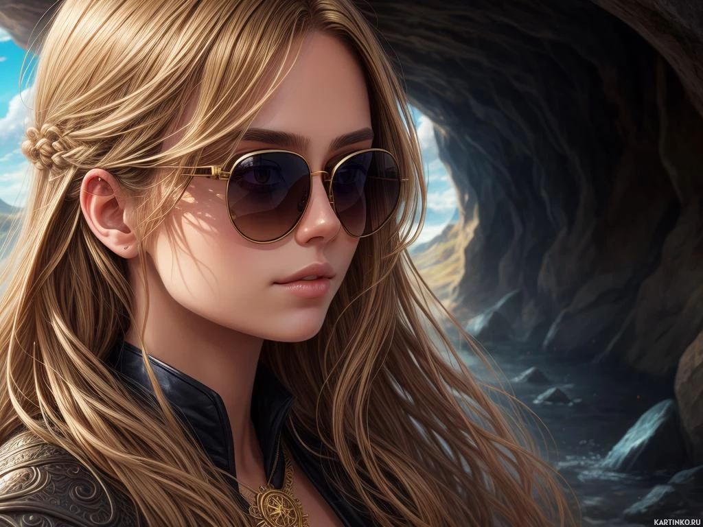 female character with blonde hair wearing sunglasses and a black outfit. She is situated in front of a large cave entrance set against a landscape background that features a clear sky, mountains, and