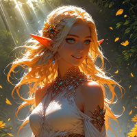 На картинке изображена девушка, похожая на эльфийку с золотистыми волосами, в роскошном платье в стиле фэнтези. У неё заострённые ушки, а на заднем плане — подсолнухи и, кажется, золотистый солнечный свет, пробивающийся сквозь деревья. Эльфийка выглядит очень изящной и гордой, на ней – замысловатые украшения.