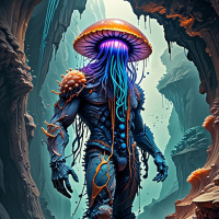 The image portrays an anthropomorphic creature with a humanoid form but with distinct fantastical features. It has a large, serene face that is predominantly blue and purple, surrounded by tendrils or roots. On its head rests what appears to be a hat with a spike on top, adding to the creature's otherworldly appearance. The creature stands in a natural environment characterized by towering rock formations that create a canyon-like structure around it. There are waterfalls visible in the background, contributing to a mystical and serene atmosphere. Below the creature is a flat area with scattered rocks and patches of grass or moss. The overall color palette of the image is dominated by cool blues, purples, and greens, which suggests an underwater or subterranean setting. The artwork style leans towards photorealism with a strong emphasis on vibrant colors and textures that give depth to the scene. The creature's presence adds a fantastical element to this otherwise realistic depiction of nature.