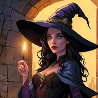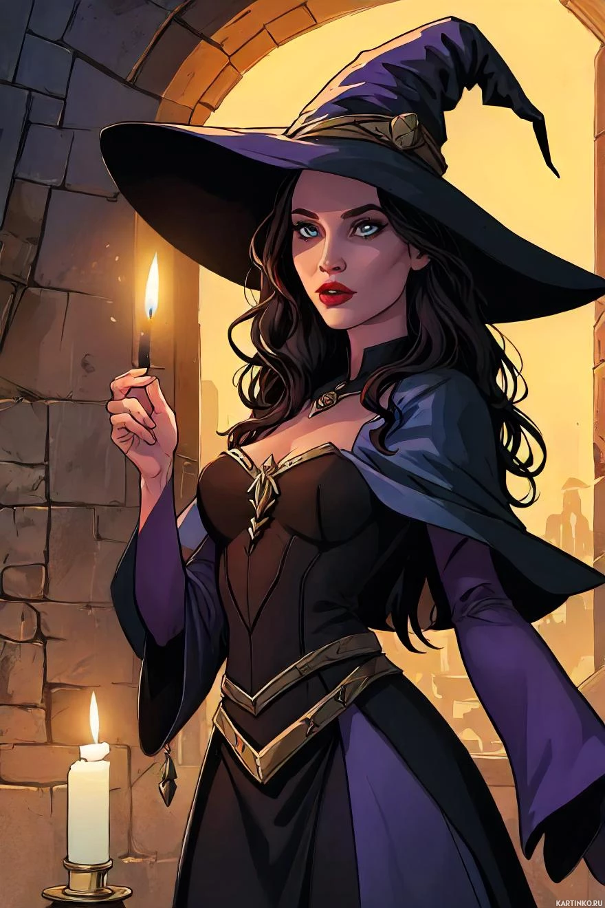 На картинке изображена женщина с темными волосами, держащая в левой руке свечу и одетая в ведьмин костюм: с остроконечной шляпой, плащом и корсетом. Она стоит в арке, обрамленной каменной кладкой, что намекает на помещение или подземное пространство. Ее выражение лица нейтральное, и она словно смотрит прямо в камеру. Освещение в сцене создает теплое сияние с золотистым оттенком, возможно, имитирующее солнечный свет, пробивающийся сквозь окна, или магические эффекты, характерные для фэнтезийных иллюстраций на тему ведьм.