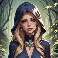 The image features a character that appears to be a blonde woman with long hair and striking blue eyes. She has an ethereal look, with fair skin and is adorned in a medieval-style outfit. Her attire includes what seems to be armor, with elements like buckles and straps suggesting functional wear for combat or protection. The character wears a large hood that drapes over her head, which adds to her mysterious appearance. The background is a fantasy-themed setting, possibly a forest or a path through the woods, enhanced with magical foliage like glowing leaves and an ethereal mist. The overall style of the image suggests it may be a piece of digital artwork, designed to evoke the aesthetic of fantasy role-playing games (RPGs) or high fantasy literature, where such characters are often depicted.