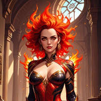 In this digital artwork, a female character with vibrant red hair and striking blue eyes stands as the central figure. She is depicted wearing a futuristic armor that predominantly features a dark red color scheme with gold accents. The armor consists of a bodysuit with sleek lines and panels, complemented by high boots that rise to her thighs. The character's attire is detailed and appears to be equipped for combat or action. Her hands are adorned with gauntlets that extend into the armor, adding a sense of strength and readiness. The armor design includes a high collar and shoulders, suggesting a blend of functionality and style. Behind her stands an ornate archway with Gothic architectural elements, which contrasts with the futuristic look of the character's attire. This juxtaposition adds depth to the image, hinting at a setting where history meets advanced technology. The lighting and composition focus on the central figure, drawing the viewer's attention to her formidable appearance. Please note that this description is based solely on the visible content of the image provided without any speculative or interpretative elements.