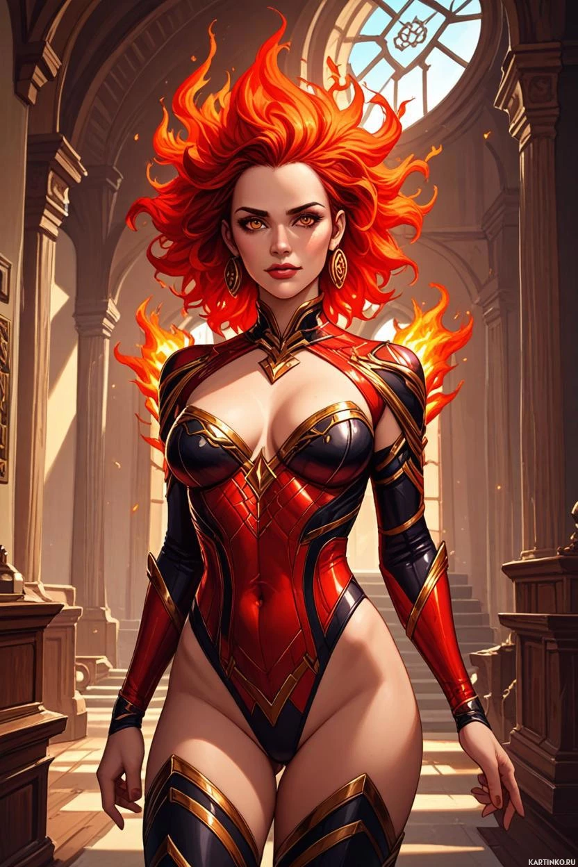 В этой цифровой картинке центральной фигурой является девушка с яркими рыжими волосами и пронзительными голубыми глазами. На ней футуристический доспех, преимущественно темно-красного цвета с золотыми акцентами. Доспех состоит из облегающего комбинезона со строгими линиями и панелями, дополненный высокими сапогами, доходящими до бедер. Одежда персонажа детализирована и выглядит так, будто она предназначена для боя или активных действий. На ее руках перчатки, которые переходят в доспех, придавая ей ощущение силы и готовности. Дизайн доспеха включает высокий воротник и наплечники, подчеркивающие сочетание функциональности и стиля. Позади нее виден резной арочный проход с элементами готической архитектуры, контрастирующий с футуристическим стилем ее доспеха. Это сопоставление добавляет глубины картинке, намекая на место, где история встречается с передовыми технологиями. Освещение и композиция акцентируют внимание на центральной фигуре, привлекая взгляд зрителя к ее внушительному облику.
