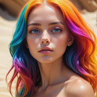 The image features a young woman with colorful hair that transitions through shades of blue, purple, and pink. Her makeup is detailed, highlighting her eyes and lips. She has a neutral expression on her face. The background appears to be an outdoor setting, possibly a desert or sandy terrain, suggesting she might be in a natural environment.