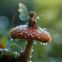 the soft glow of sunlight filtering through the canopy of leaves overhead. The fairy appears to be engaging with the environment around her, possibly enjoying the tranquility and beauty of nature.