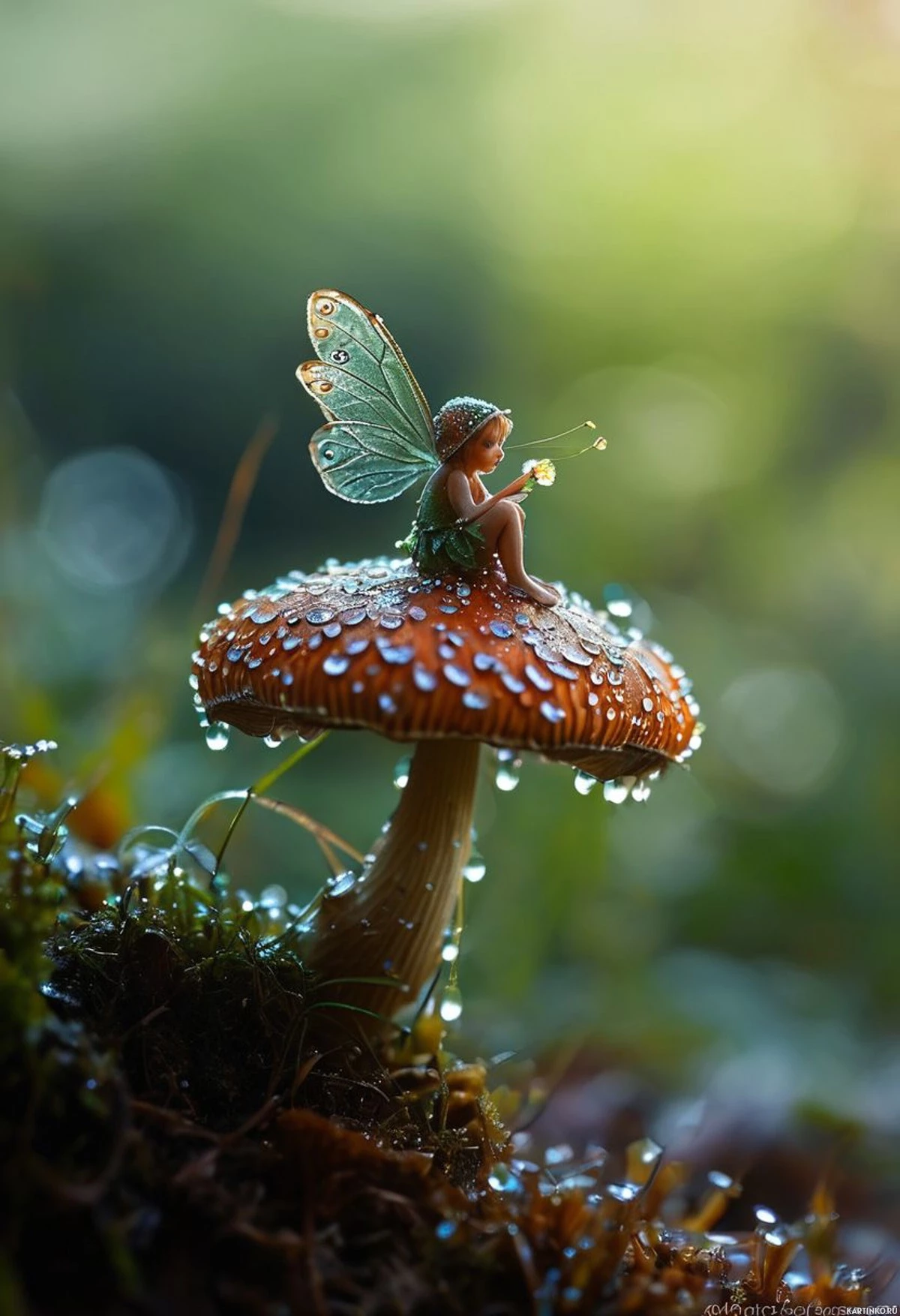 green hair is seated on a mushroom. The mushroom is adorned with