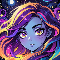 The image features a stylized illustration of a girl with colorful hair and cosmic elements in the background. She has fair skin, large expressive eyes, and her hair is a vibrant mix of colors including blues, purples, reds, and yellows. There are stars and nebula-like patterns behind her head, adding to the celestial theme. The color palette of the image is predominantly bright and diverse, with a focus on pastel tones interspersed with bold accents.