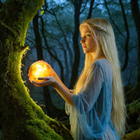 The image features a figure who appears to be a girl with long blonde hair, wearing a light-colored dress that suggests a fantasy or historical setting. She stands in front of an ancient tree with twisted branches and green moss, indicative of a forest environment. In her hands, she holds what looks like a magical object—a spherical shape that could be interpreted as a crystal ball. The lighting is dim with a focus on the girl and the object she holds, creating an atmosphere of mystery and enchantment. The background fades into darkness, emphasizing the solitary figure and her interaction with the object.