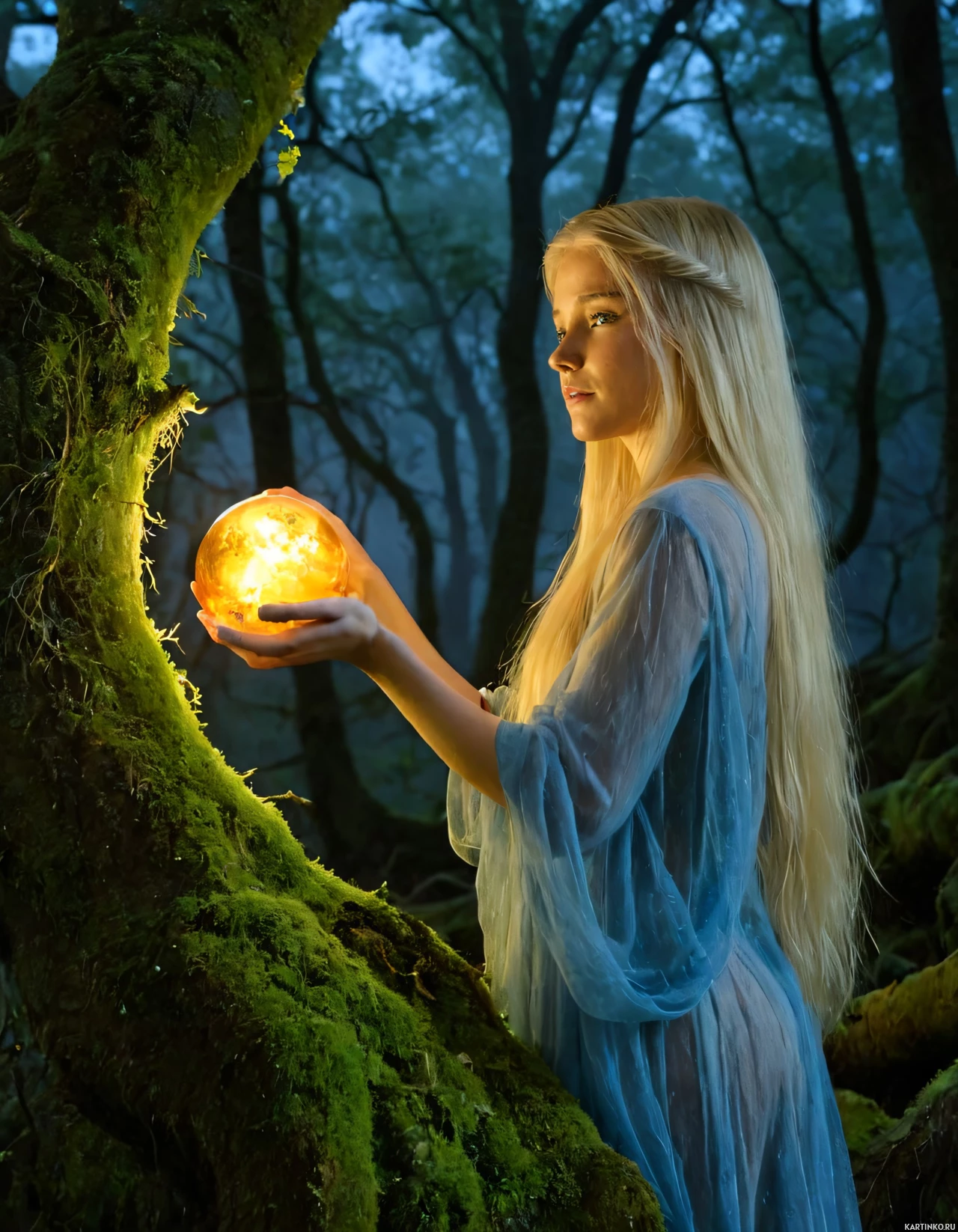 На картинке изображена девушка с длинными светлыми волосами в светлом платье, словно сошедшем со страниц сказки или исторической хроники. Она стоит перед древним деревом с переплетенными ветвями и зеленой мхом корой, окруженная лесной глушью. В руках у нее предмет, похожий на магический артефакт – сферическая форма, напоминающая хрустальный шар. Освещение приглушенное, акцентирующее внимание на девушке и предмете, который она держит, создавая атмосферу тайны и волшебства. Фон погружается в темноту, подчеркивая одинокую фигуру и ее взаимодействие с артефактом.