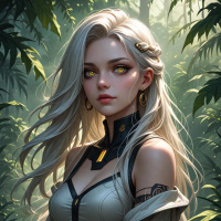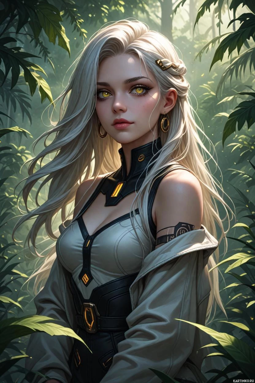 На картинке изображена девушка с белыми волосами и пронзительными голубыми глазами. У нее светлая кожа, а выражение лица серьезное или задумчивое. На ней наряд, сочетающий элементы доспехов, кажется, из кожи или темной ткани, украшенной металлическими деталями. Задний план – пышная зелень, что указывает на лесной или джунглевый пейзаж. На дальнем плане видны деревья, придающие сцене глубину. В целом, картинка создает атмосферу фэнтези или приключений.