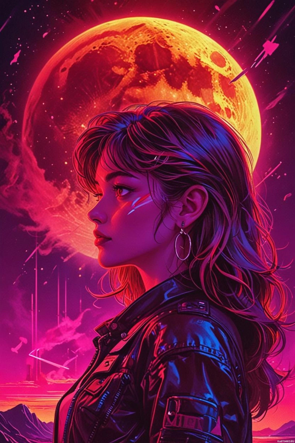 На картинке женщина с темными волосами смотрит влево. У нее спокойное выражение лица, на ней, похоже, кожаная куртка. Ее светлая кожа контрастирует с темными волосами. На заднем плане – большое красное лунное светило, а под ним – пейзаж с возвышающейся конструкцией, напоминающей замок или собор. Цвета насыщенные и яркие, с переходом от фиолетового к оранжевому вокруг луны и розовато-оранжевым оттенком у горизонта. Вдалеке можно заметить тусклый хвост кометы. Женщина расположена в центре композиции, привлекая внимание.