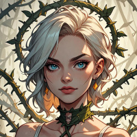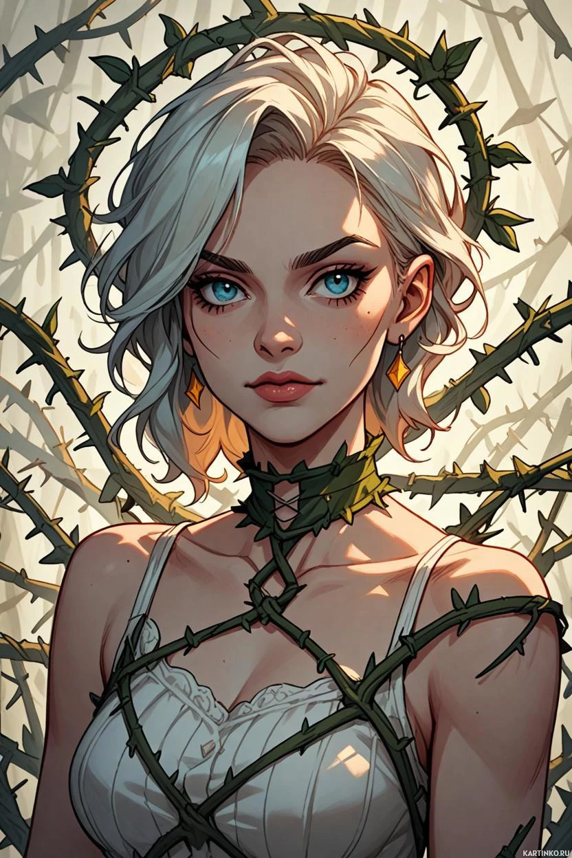 На картинке изображена женщина с белыми волосами и голубыми глазами. Она выглядит молодой, что подчеркивается чертами лица и выражением. На ней одежду, напоминающую корсет или лиф, украшенный растительным орнаментом. Фон указывает на лесной пейзаж, создавая ощущение природной среды.