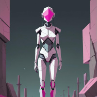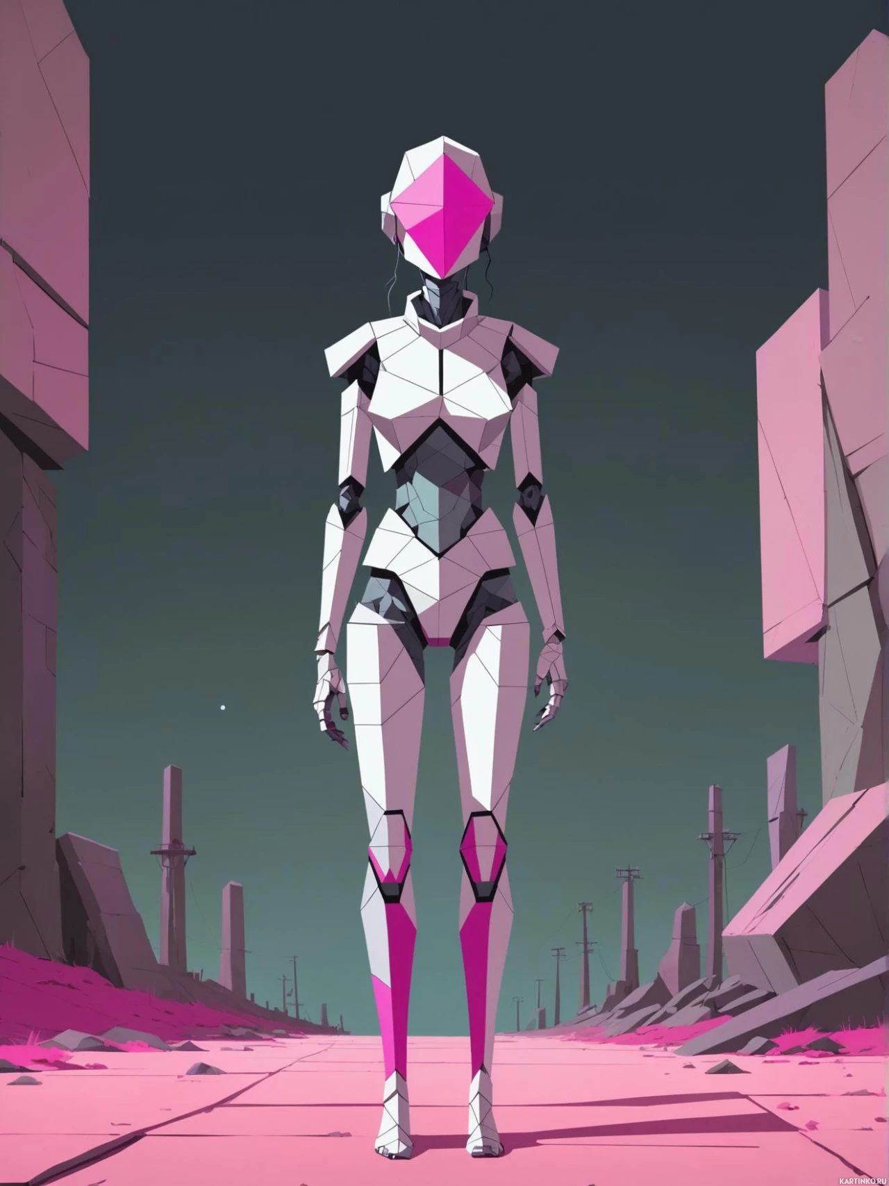 На картинке изображен гуманоидный робот, стоящий в городском пейзаже ночью. У робота розовые акценты, он словно сделан из металла, с видимыми механическими деталями – суставами и приводами. Он стоит прямо, руки опущены вдоль тела. Вокруг робота – полуразрушенные здания и обломки, что говорит о районе, пережившем войну или катастрофу. Освещение тусклое, и сцену покрывает темно-сине-зелёный оттенок, возможно, из-за ночного времени суток или пасмурной погоды.