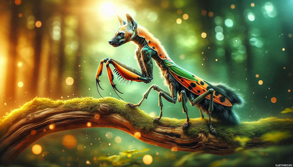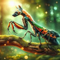 a feathered headdress, chestpiece, and arm coverings with patterns resembling those found on the body of an insect, such as a butterfly. The animal is surrounded by