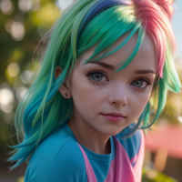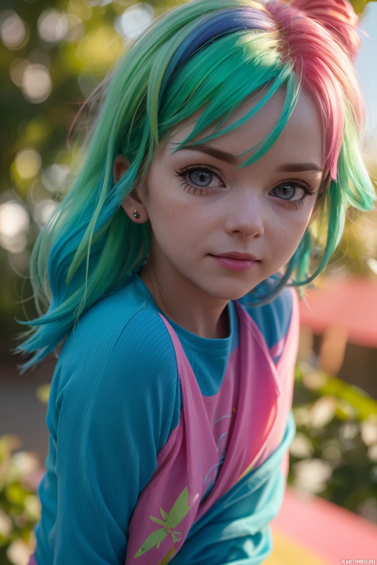 a young individual with long, brightly colored hair that transitions through various shades of green to blue. Their face is adorned with