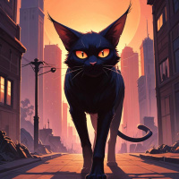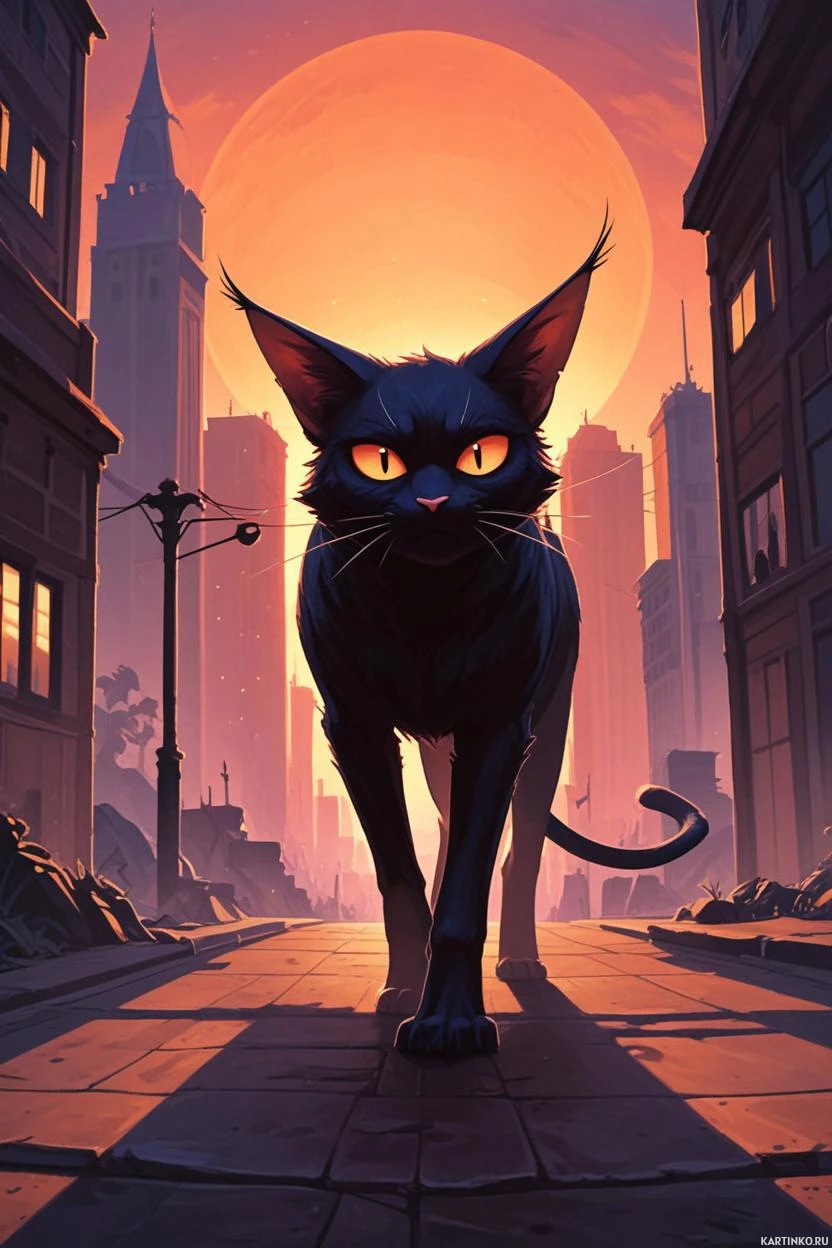 На картинке — крупный черный кот идет по мостовой на закате, под оранжевым небом, где ярко видна полная луна. На заднем плане видны здания и арки, характерные для европейского города. Уличные фонари освещают сцену. У кота зловещее выражение, а глаза ярко горят в полумраке.
