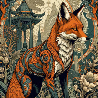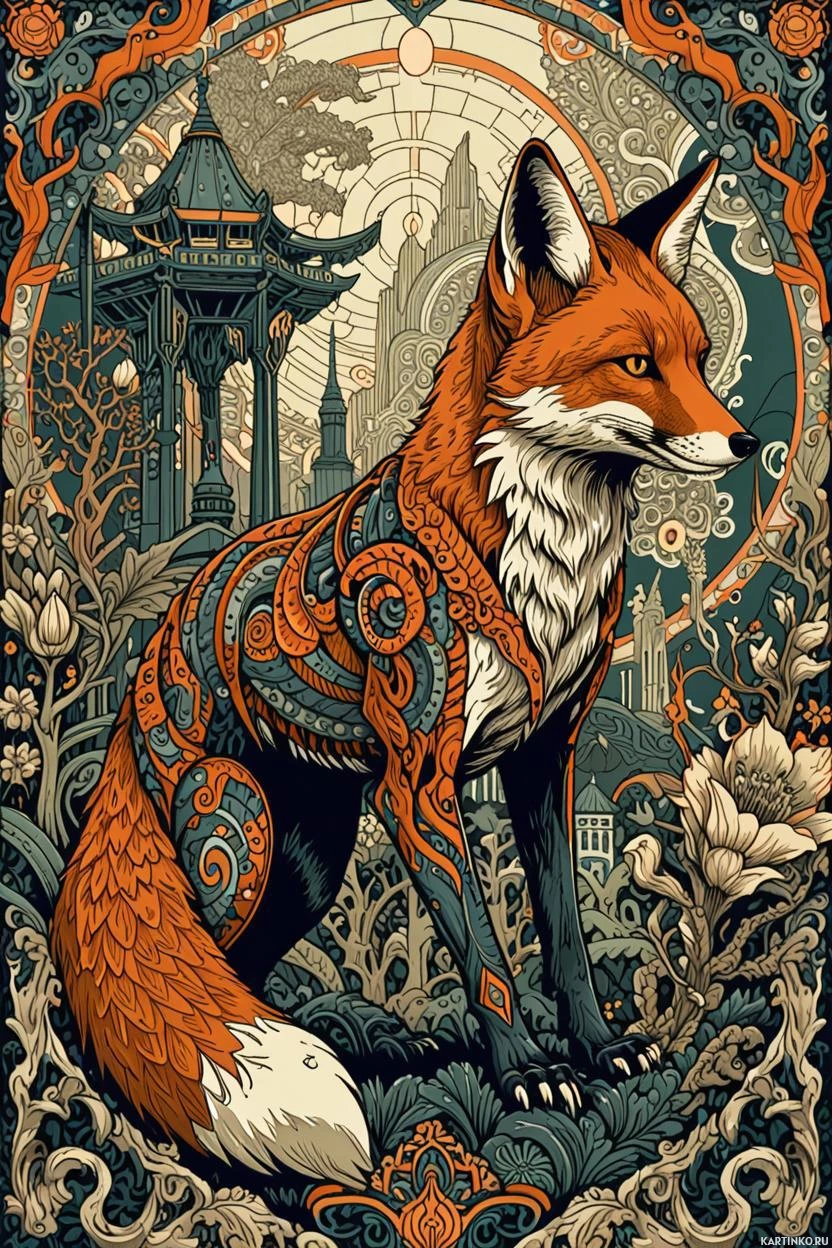 На картинке изображена иллюстрация лисы. Стиль детализированный и яркий, лиса запечатлена стоя на фоне, похоже, лесной подстилке. Она украшена механическими деталями, включая шестерёнки и провода, органично вплетенные в её тело, что придает ей искусственный или роботизированный вид. Вокруг лисы – разнообразные растения и цветы, создающие естественный фон в иллюстрации. На заднем плане виден ясное ночное небо, освещенное небесными светилами, что указывает на ночное время действия. Вся композиция картинки имеет сложную окантовку с замысловатыми узорами и мотивами.