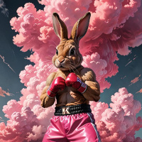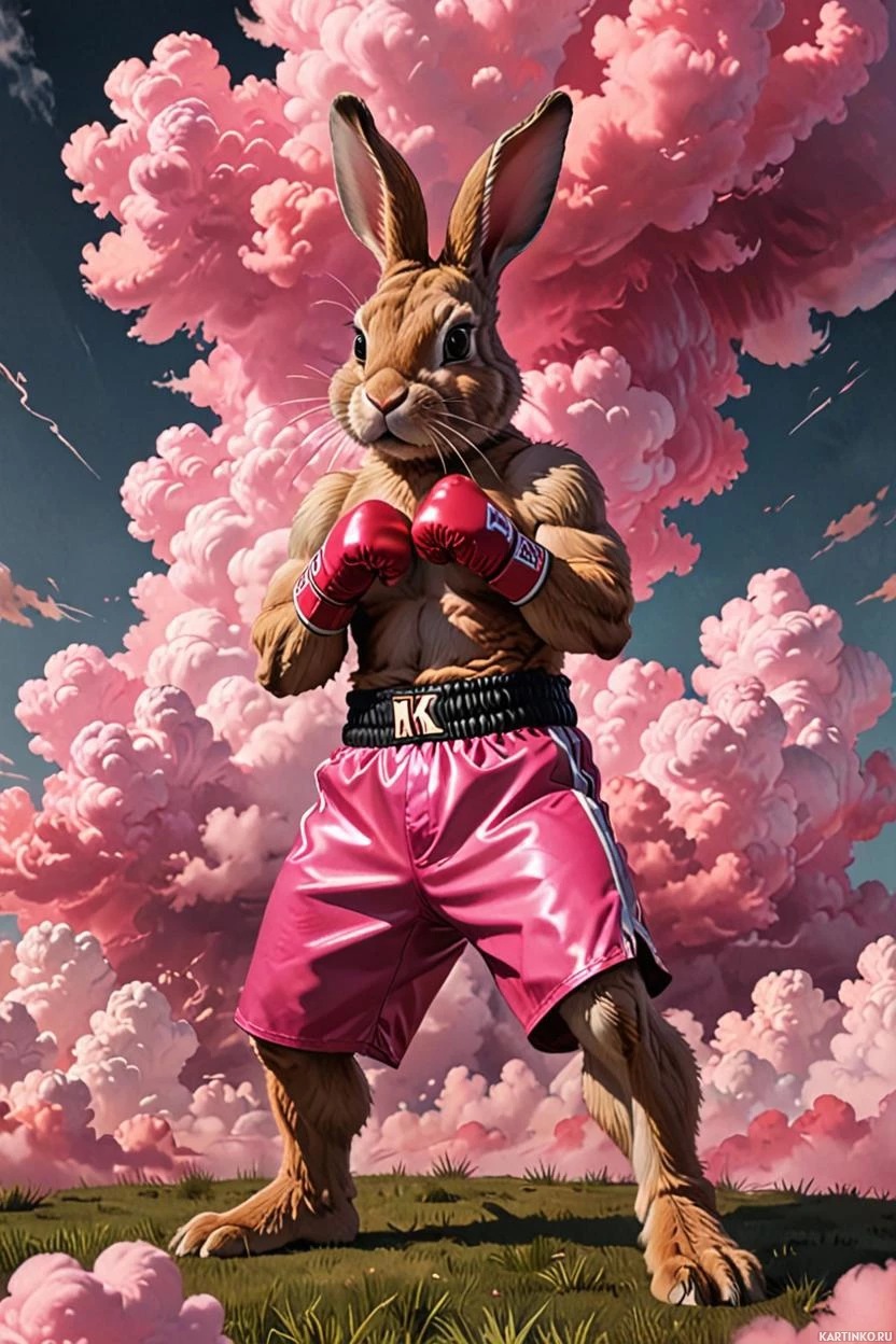 Картинка изображает антропоморфного кролика с мускулистым телом, стоящего в уверенной стойке боксера. На нем розовые боксерские перчатки и шорты. На заднем плане — драматичный фон, напоминающий облака с огненными оттенками красного и оранжевого, создающий яркий контраст с одеждой кролика. У персонажа напряжены руки, демонстрирующие рельефные мышцы.