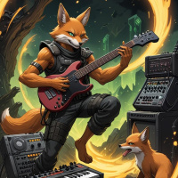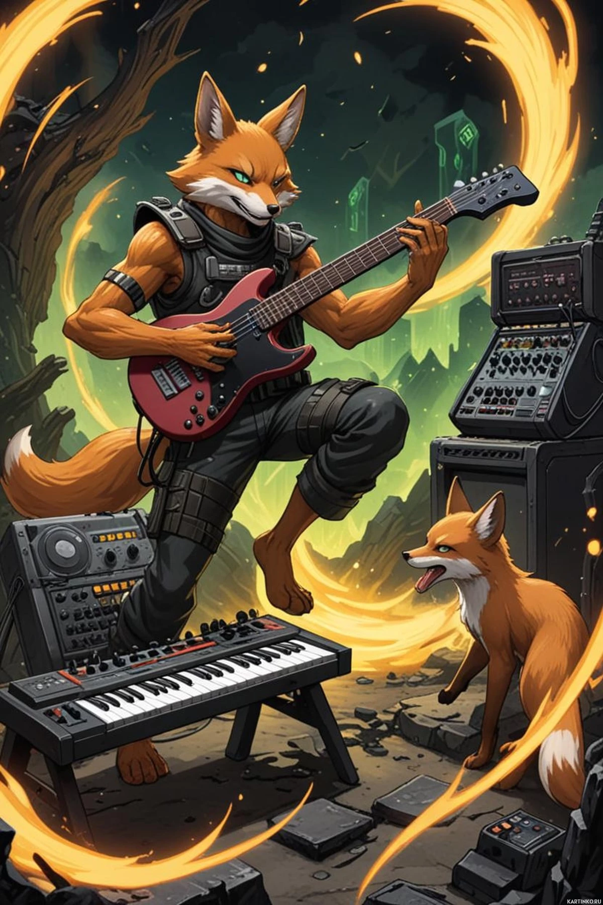 На картинке в центре стоит антропоморфный лис, обладающий мускулистой фигурой и держащий в руках электрогитару, на которой, похоже, играет. Справа от него находится другой лис, сидящий за клавишами, возможно, тоже играющий на них. Фон предполагает, что они находятся в пещере или подземном помещении, с драматичным освещением и ощущением глубины благодаря перспективе. Вокруг лисов присутствует элемент, напоминающий пламя, что добавляет картине фантастичности.