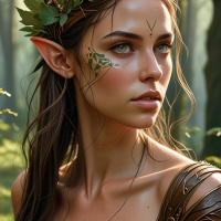 The image features a woman portraying an elf in a fantasy setting. She has long brown hair with green accents and pointed ears resembling those of an elf. Her makeup is enhanced to give her eyes a glowing effect, likely representing magical or mystical qualities. She wears a gold headpiece with leaf-like decorations that contribute to the fantasy theme. Her complexion is fair, and she has a neutral expression on her face. She's dressed in an outfit that mimics traditional depictions of elves, consisting of a dark green bodice adorned with gold embellishments, paired with a long, leafy garland draping over one shoulder and down to the waist, which appears to be made of leaves. The background suggests a lush forest with trees that have a misty quality, adding to the ethereal atmosphere of the image.