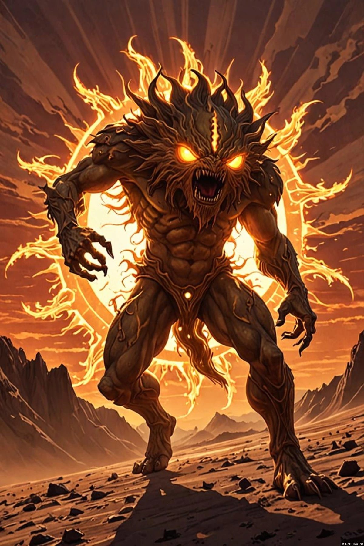 На картинке изображён персонаж фэнтези-монстра. Это гуманоидная фигура с гипертрофированными мускулами, стоящая на бесплодной земле, охваченной огнём. У существа угрожающее выражение лица, и оно украшено огненными узорами или языками пламени, исходящими из тела или волос, что указывает на связь с огнём. Стиль рисунка динамичный и драматичный, с яркими цветами и резкими контрастами, создающими напряжённую и потустороннюю атмосферу.