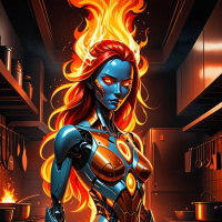 The image depicts a science fiction robot character with red hair and flames emanating from its hands, standing in what appears to be an industrial kitchen setting. The robot is wearing some sort of metallic armor or body suit that has mechanical components visible on it. The environment suggests a futuristic theme, possibly indicating a scene from a science fiction narrative.