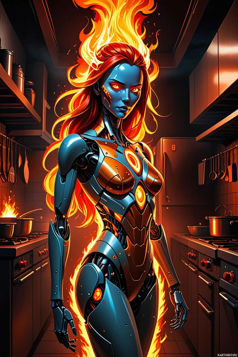 На картинке изображен персонаж робота в стиле научной фантастики с красными волосами и пламенем, исходящим из его рук. Он стоит на фоне, похожего на промышленную кухню. На роботе надета металлическая броня или костюм, с видимыми механическими элементами. Окружение создает футуристическую атмосферу, возможно, сцена из научно-фантастического сюжета.