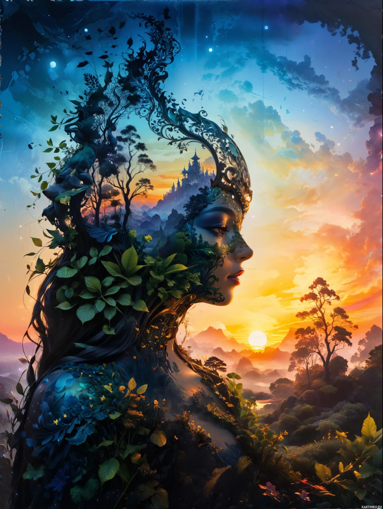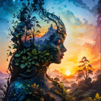 lush vegetation and trees, suggesting a fantastical or mythical forest. The overall impression is one of harmony between nature and