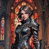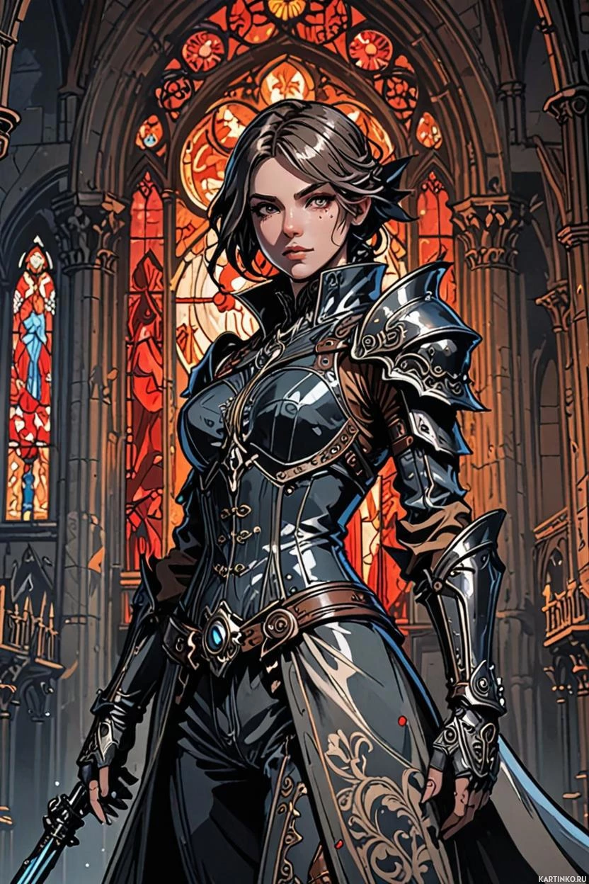 На картинке изображена женский персонаж в доспехах, выполненных в фэнтезийном стиле. У нее короткие темные волосы, и на голове — шлем или головной убор, скрывающий лицо. В левой руке она держит рукоять меча, который переброшен через бедро. Правая рука покоится возле талии. Она стоит перед резным арочным проемом с витражными окнами, напоминающими церковь. На ней – нагрудник, наручи, поножи, украшенные сложным орнаментом, а также обтягивающие брюки. С плеч спадает плащ, под доспехами – кожаный наряд. Общий стиль картинки перекликается с фэнтезийным искусством, часто используемым для создания персонажей в видеоиграх и подобных медиа.