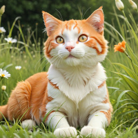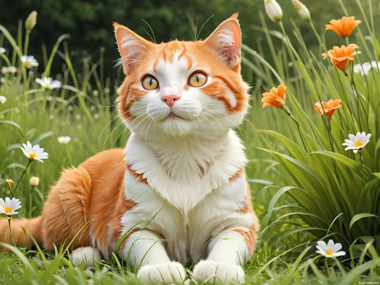 На картинке – кот, сидящий на траве, на заднем плане – поле диких цветов, среди которых желтые и белые. У кота характерная полосатая расцветка с разнообразными оттенками оранжевого и белого меха. Он смотрит вверх с немного приоткрытым ртом, словно внимательно наблюдает за чем-то или проявляет интерес к окружающей обстановке.