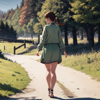 Картинка изображает спокойную сцену: девушка идёт по тропинке в, кажется, лесистой местности осенью. На ней платье в стиле средневековья или фэнтези, что наводит на мысль о персонаже из игры или истории, действие которых происходит в эпоху прошлого. На заднем плане – деревья с яркой осенней листвой, хвойные сосны и чистое небо с редкими облаками. Тропинка грунтовая и, кажется, извивается среди природы.
