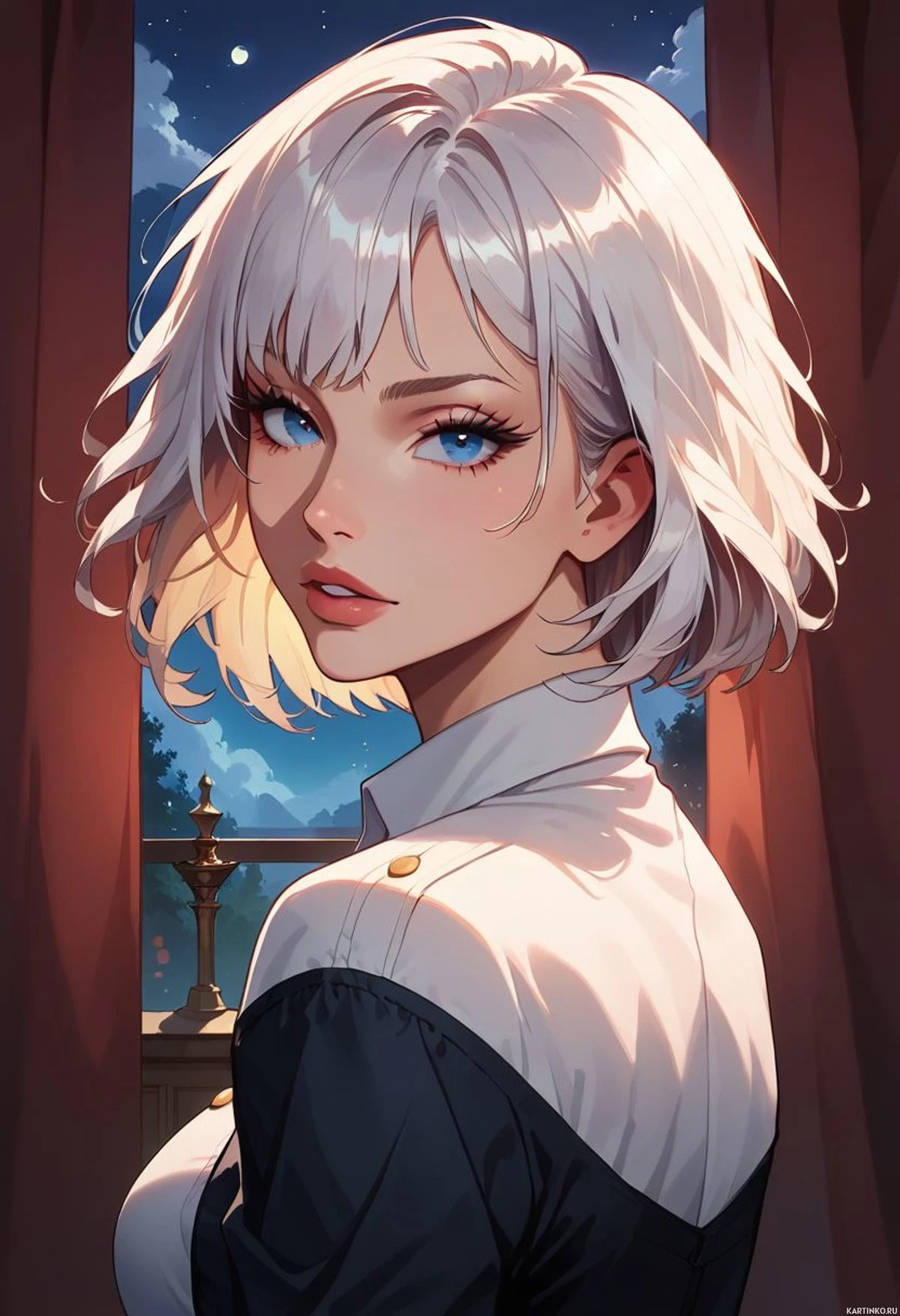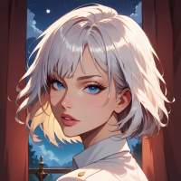 white hair. She has a youthful appearance, with
