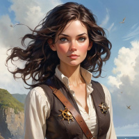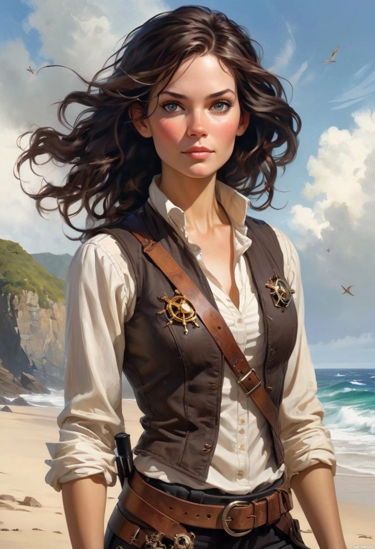 На картинке изображена стилизованный портрет девушки, стоящей на песчаном пляже. У нее длинные волнистые каштановые волосы, а на ней – наряд, включающий корсет с шнуровкой, облегающий жилет или куртка и брюки с ремнями на талии. Одежда отсылает к историческому фэнтези, напоминающему моду XVIII века. Поза девушки уверенная и властная: руки опущены вдоль тела, а взгляд направлен прямо на зрителя. На заднем плане – чистое небо над спокойной водой, возможно, океаном, что подчеркивает прибрежный пейзаж.