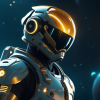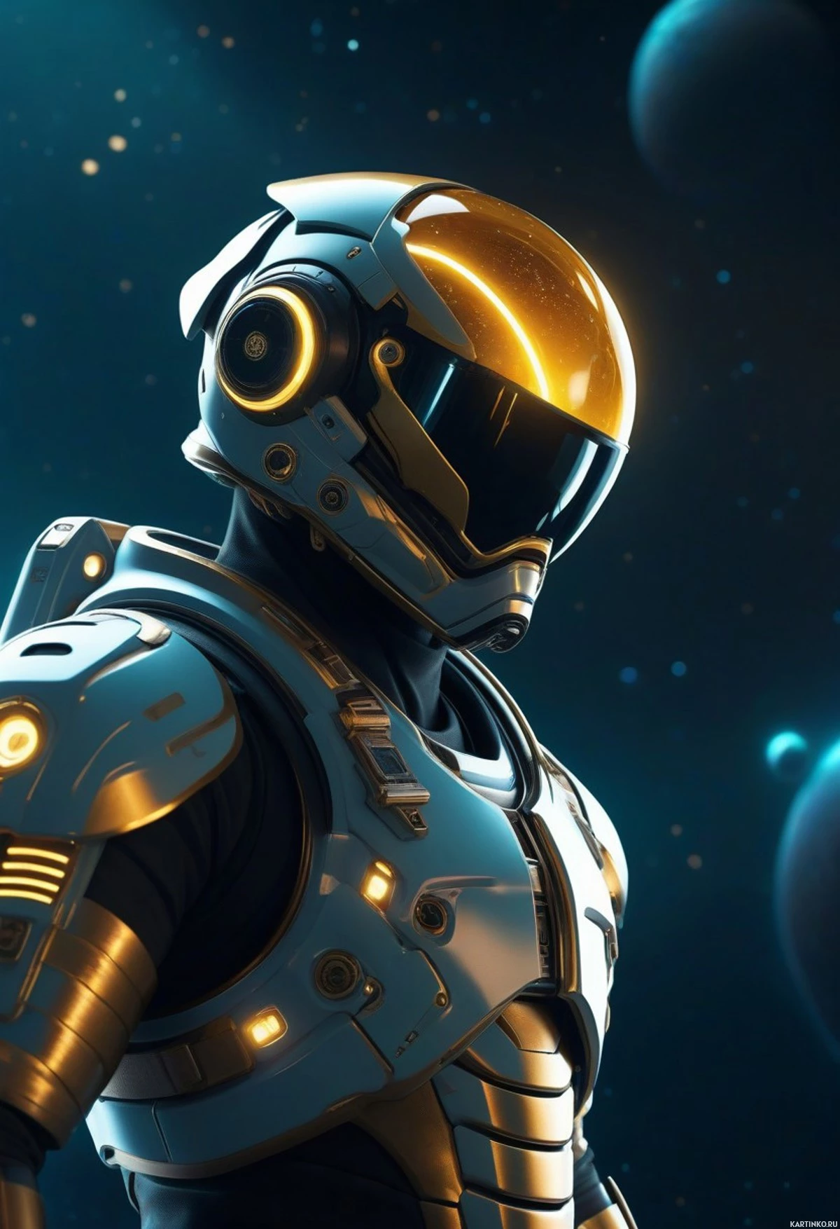 На картинке изображён персонаж в футуристических доспехах и шлеме с забралом, скрывающим лицо. Доспехи преимущественно синего цвета с золотыми акцентами, что намекает на передовые технологии или дизайн. Фон предполагает космическую обстановку со звёздами, что говорит о том, что действие происходит в открытом космосе. Общий стиль картинки отсылает к научно-фантастическим мотивам, где такие персонажи часто встречаются в историях и медиа, действие которых разворачивается в будущем.