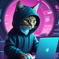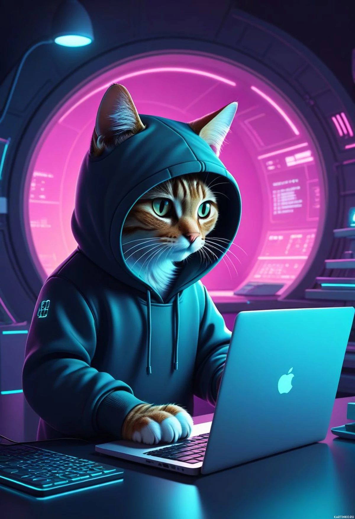 На картинке кот в черном худи, скрывающем его мордочку. Он словно печатает на ноутбуке Apple лапкой. На заднем плане – футуристичная панель управления с цифровыми дисплеями и экранами. Фон создает впечатление высокотехнологичного, киберпанк-сеттинга.