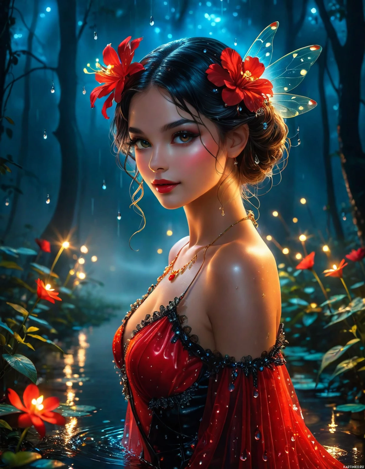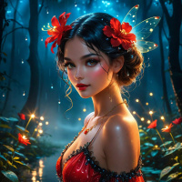 forest setting. There are trees on either side of the character's face, creating a natural frame for her. The lighting in the scene is soft and ambient, contributing to the overall fairy-like atmosphere of the image.