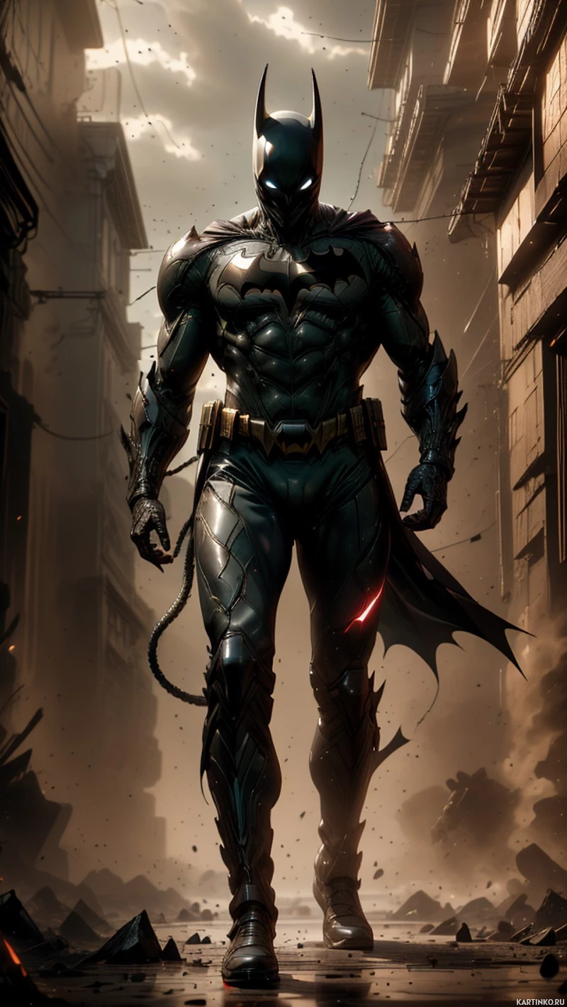 На картинке запечатлён персонаж в костюме, стоящий на фоне разрушений и обломков, что указывает на сцену сражения. На нём тёмная броня с металлическими элементами и деталями, а также развевающийся за спиной плащ. У него мускулистое телосложение, что говорит о физической силе, а поза выдает готовность к бою. Голова повернута вбок, на лице решительное выражение. На заднем плане виден дым и завалы. Стиль картинки – реалистичный, с высоким уровнем детализации, подчеркивающим напряженность происходящего.