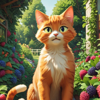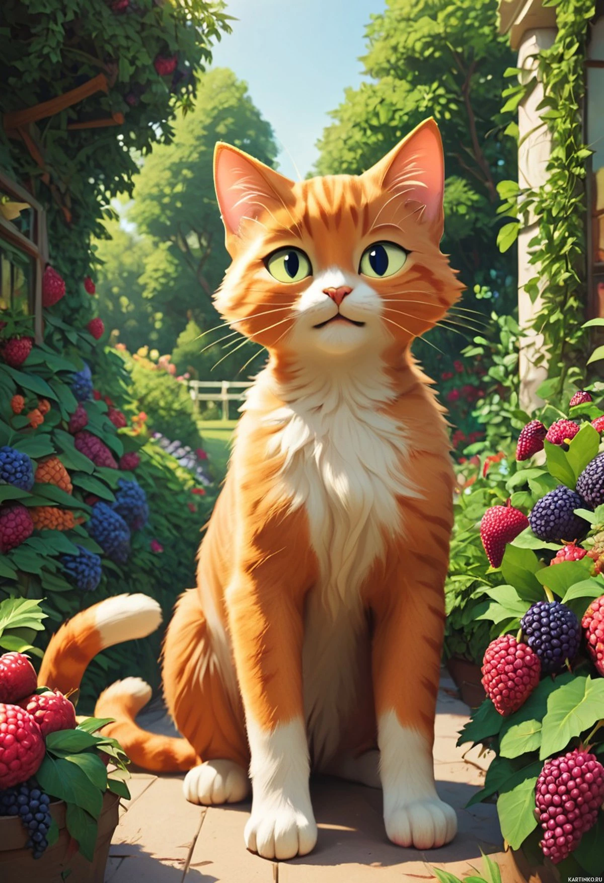 На картинке изображён рыжий полосатый кот с белой грудкой, сидящий на каменной дорожке. У кота любопытное выражение мордочки, он смотрит вверх и немного вправо, с розовым носом и настороженными ушками. На заднем плане – сад с пышной зеленью, растения и деревья. Слева от кота висят кашпо с цветами фиолетовых, голубых и белых оттенков. Справа от кота на земле – яркие красные ягоды, возможно, малины или похожие плоды. Кажется, сцена взята из мультфильма, судя по стилизованному виду и сказочным элементам сада.