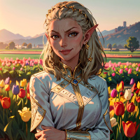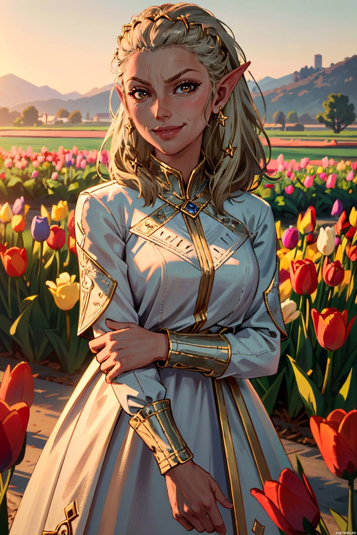 На картинке изображена сказочная героиня, одетая как эльфийская принцесса. У неё длинные светлые волосы и белое платье с золотой отделкой, что указывает на её королевское происхождение в этом фэнтезийном мире. На шее у неё золотое ожерелье с голубым камнем. Она стоит посреди поля, усыпанного разноцветными тюльпанами. На заднем плане – замок, возвышающийся на холме под закатным или рассветным солнцем, озаряющим всю сцену тёплым светом. Героиня смотрит вдаль с задумчивым выражением лица.
