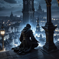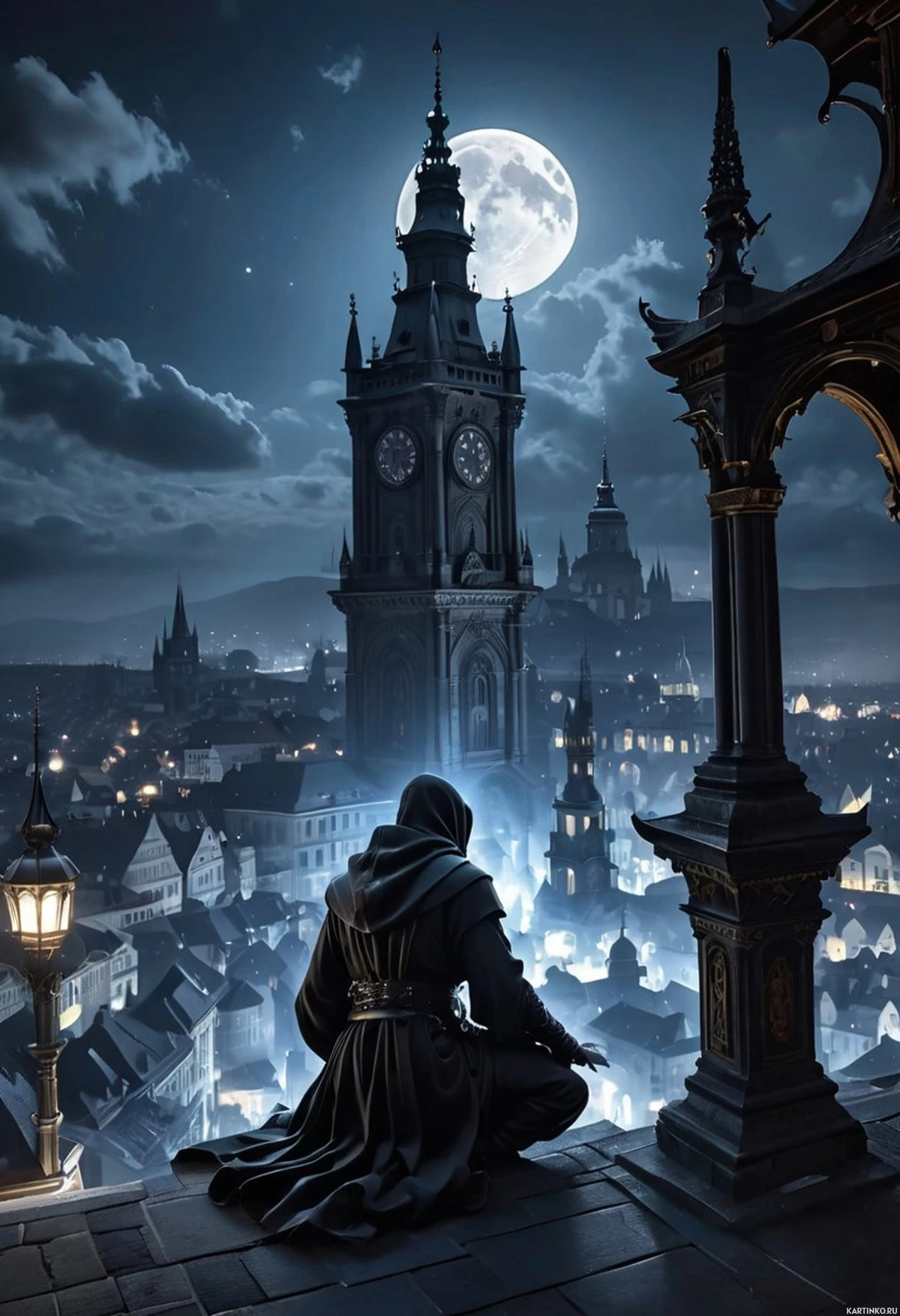 На картинке изображен человек, сидящий на каменных ступенях, ведущих к величественному готическому собору. Фигура одета в плащ и капюшон, что придает ей безымянность. По небу виднеется луна, а вокруг царит темнота, что указывает на ночное время суток. На заднем плане видны несколько часов.