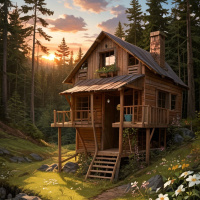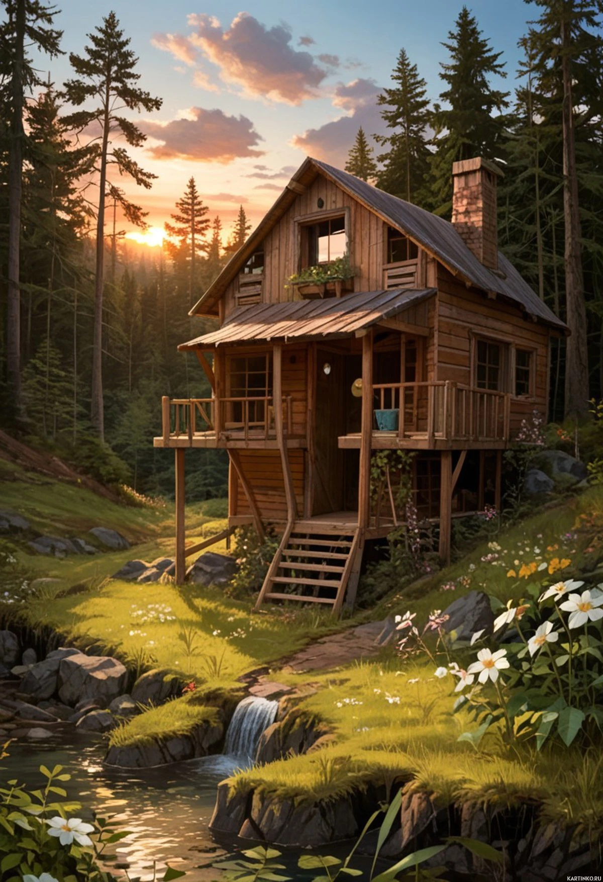 Картинка изображает живописную сцену: деревянный домик, спрятанный среди леса, словно в предрассветный или предзакатный час, судя по мягкому освещению и отблескам вокруг солнца. Домик окружён высокими деревьями с зеленой листвой, что говорит о том, что это, вероятно, весна или лето. Небо окрашено в тёплые тона возле солнца и более холодные ближе к горизонту, что указывает на то, что фотография сделана в сумерках.
