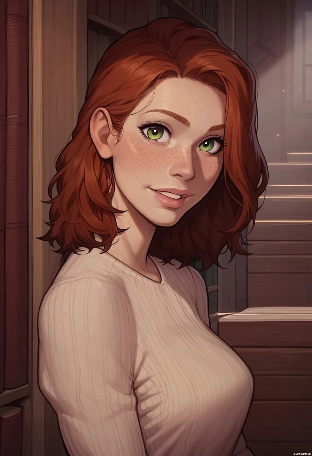 рыжие волосы | Red-haired | Стилизованный женский персонаж с румяными щеками и яркой улыбкой
