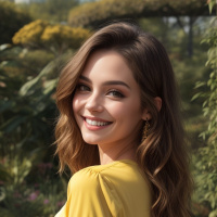 The image shows a young woman smiling at the camera. She has long dark hair and appears to be wearing makeup that enhances her natural features. Her attire includes a yellow, off-the-shoulder top with a ruffled detail on the sleeve. The background is blurred but suggests an outdoor setting with natural lighting, possibly indicating it was taken during the day.
