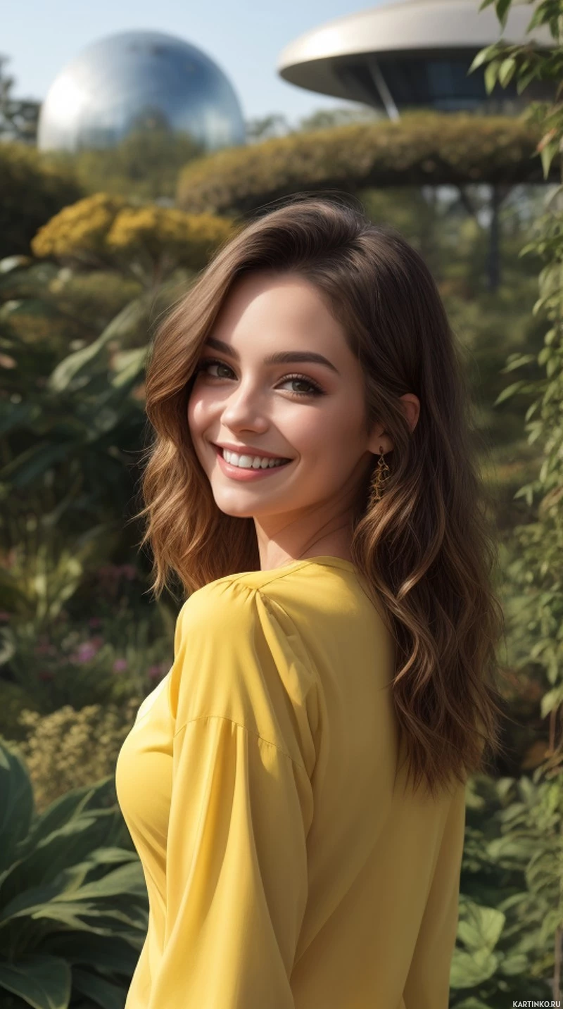 На картинке молодая женщина улыбается в камеру. У неё длинные тёмные волосы, и кажется, что она надела макияж, подчеркивающий её естественную красоту. На ней жёлтый топ с открытыми плечами и воланом на рукаве. Фон размыт, но создаёт впечатление, что это съёмка на улице при естественном освещении, возможно, днём.