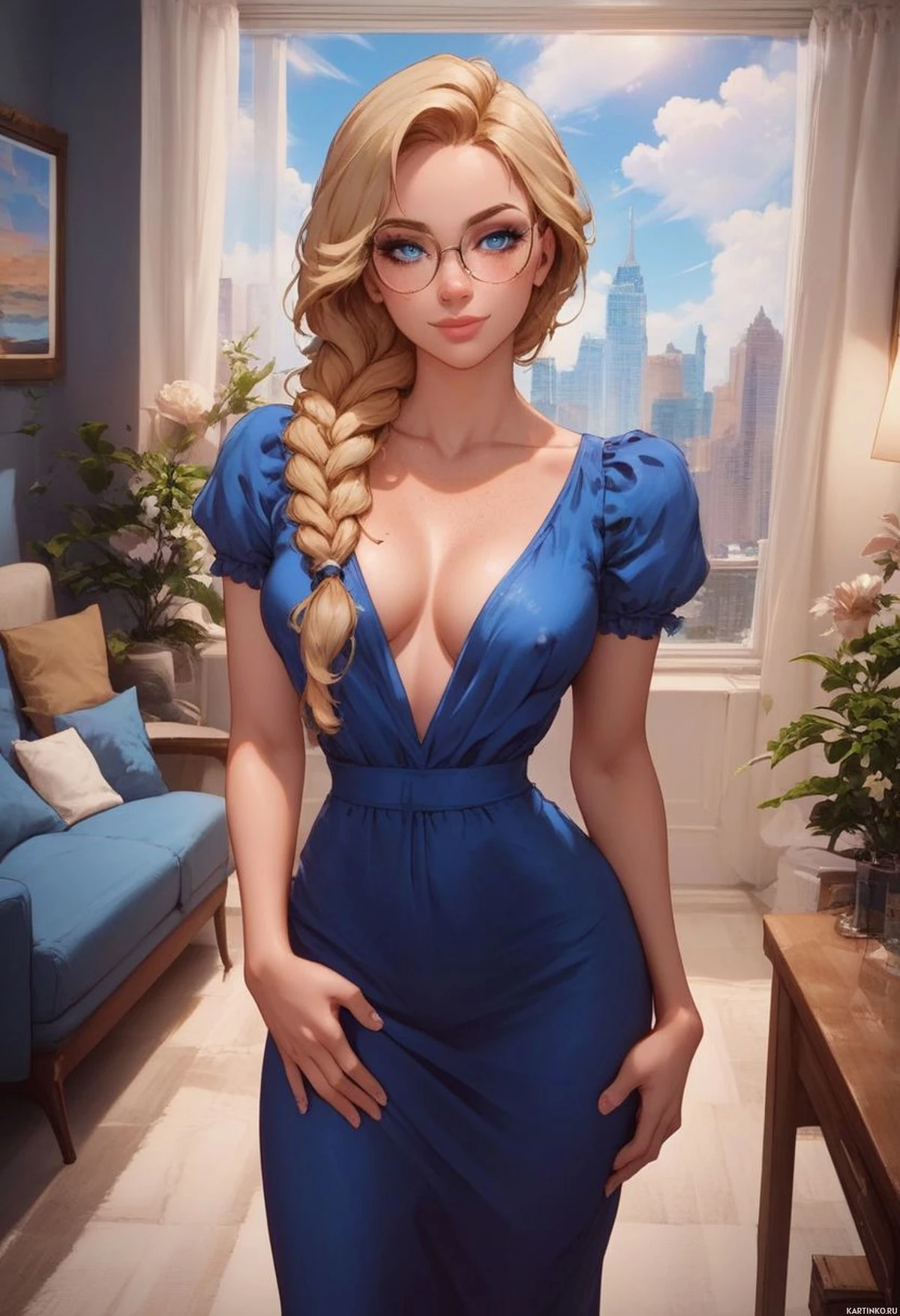 potted plants, and a small figurine placed on a surface that looks like a mantel or console table. The lighting suggests it could be daytime, given the presence of natural light coming through the windows. The artwork is detailed with attention to shading and highlights, which gives the character a three-dimensional appearance. This style is commonly associated with digital illustrations used in various media such as comic books, graphic novels, video games, and concept art for films or television series.